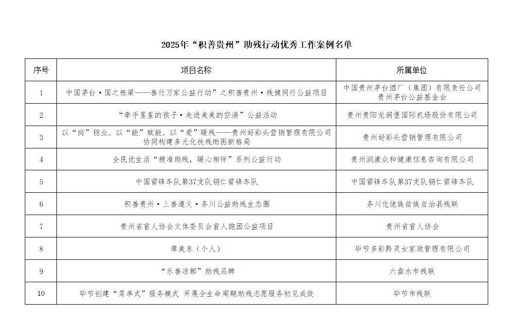 2025年“积善贵州”助残行动优秀工作案例名单截图。